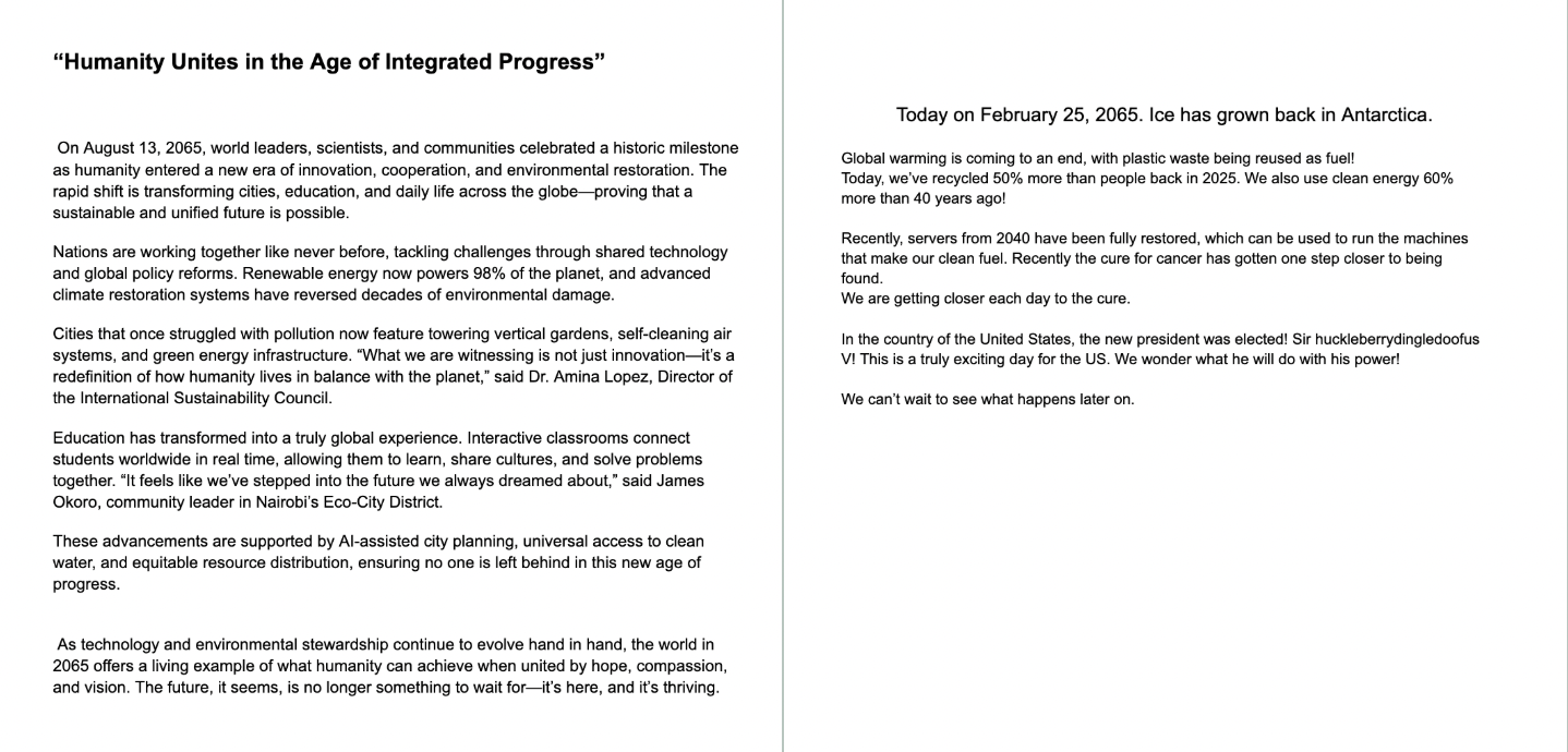 Highly creative news articles on the advancements in 2065! Special shoutouts to these learners for standout articles:
