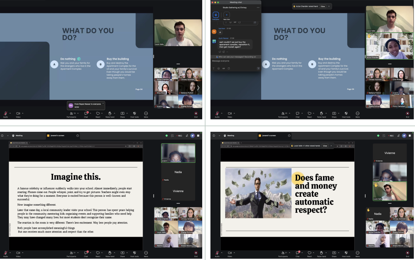 Monday: Monday, two learners presented Socratic launches for the Studio! Louis presented a launch that dealt with a scenario where an oil tycoon had to choose between drilling more oil for profit and displacing residents of an apartment complex. Jovanni then led a launch that had learners discussing if we respect money, fame, or status more. Both launches prompted thoughtfulness and lively discussion!