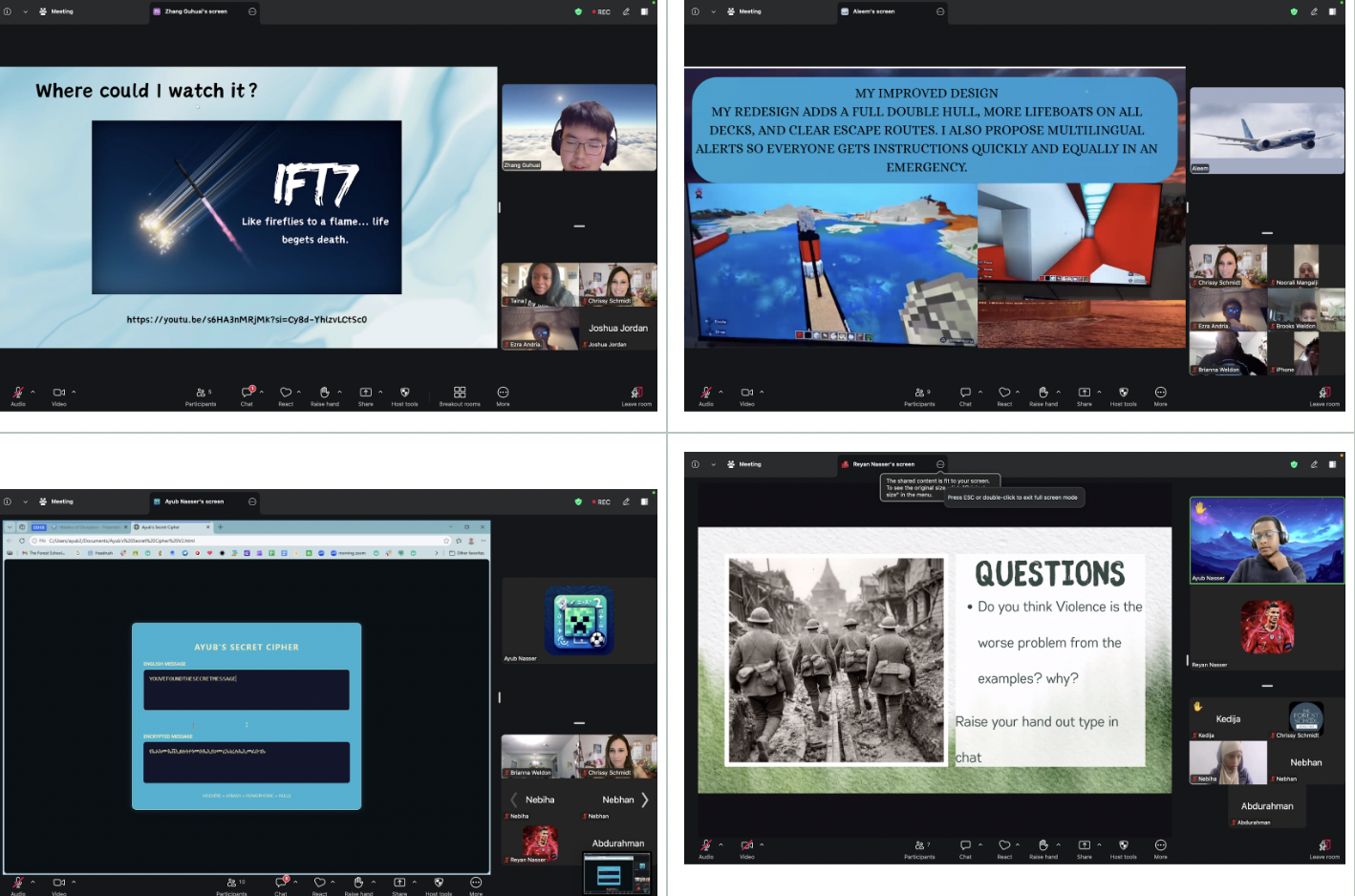 Tuesday: Tuesday, learners gathered for Dress Rehearsal. We had so many tech issues with Zoom, wifi, and individual devices, but learners remained calm and problem solved together with Guides to find solutions. Each breakout room team met to discuss roles and order or presentations for Wednesday’s Exhibition.